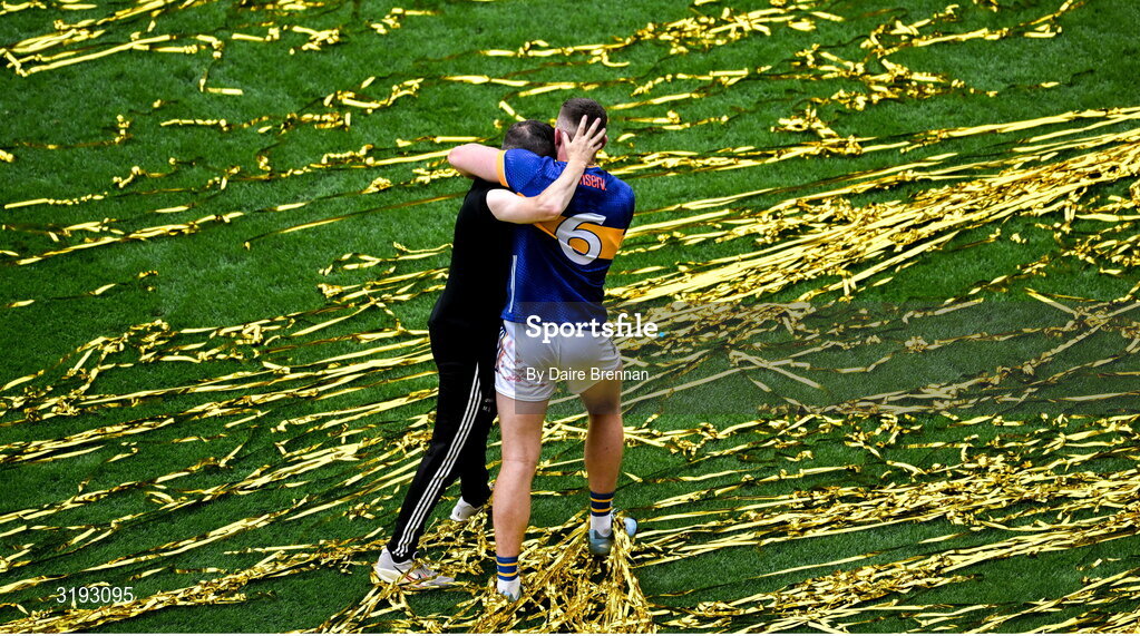20 July 2025; Ronan Maher of Tipperary celebrates with coach Michael Bevans after the GAA Hurling All-Ireland Senior Championship final match between Cork and Tipperary at Croke Park in Dublin. Photo by Daire Brennan/Sportsfile