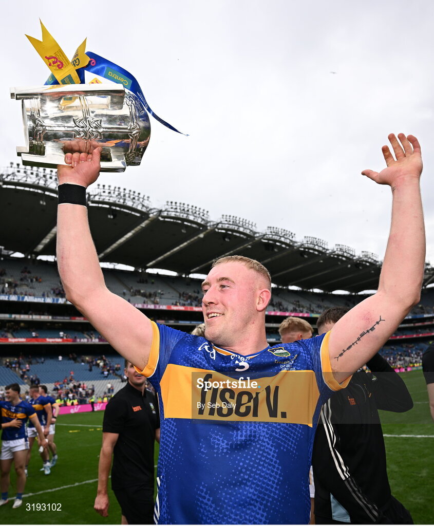 20 July 2025; Eoghan Connolly of Tipperary celebrates with the Liam MacCarthy cup after his side's victory in the GAA Hurling All-Ireland Senior Championship final match between Cork and Tipperary at Croke Park in Dublin. Photo by Seb Daly/Sportsfile