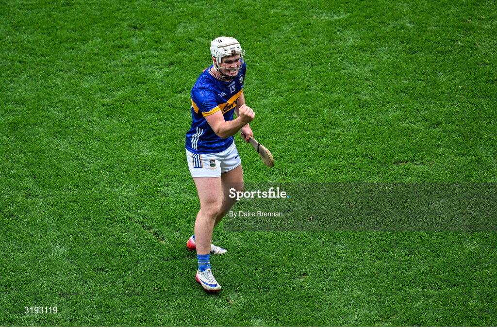 20 July 2025; Darragh McCarthy of Tipperary celebrates a second half point during the GAA Hurling All-Ireland Senior Championship final match between Cork and Tipperary at Croke Park in Dublin. Photo by Daire Brennan/Sportsfile