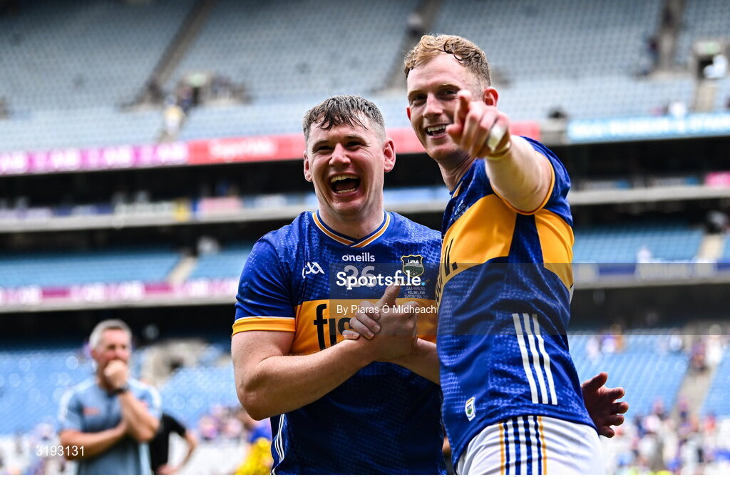 20 July 2025; Tipperary players Alan Tynan, left, and Michael Breen celebrate after their side's victory in the GAA Hurling All-Ireland Senior Championship final match between Cork and Tipperary at Croke Park in Dublin. Photo by Piaras Ó Mídheach/Sportsfile