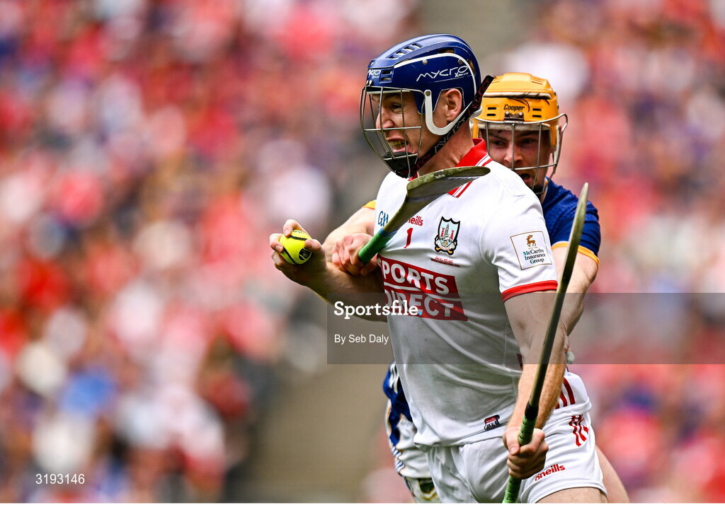 20 July 2025; Cork goalkeeper Patrick Collins in action against Andrew Ormond of Tipperary during the GAA Hurling All-Ireland Senior Championship final match between Cork and Tipperary at Croke Park in Dublin. Photo by Seb Daly/Sportsfile