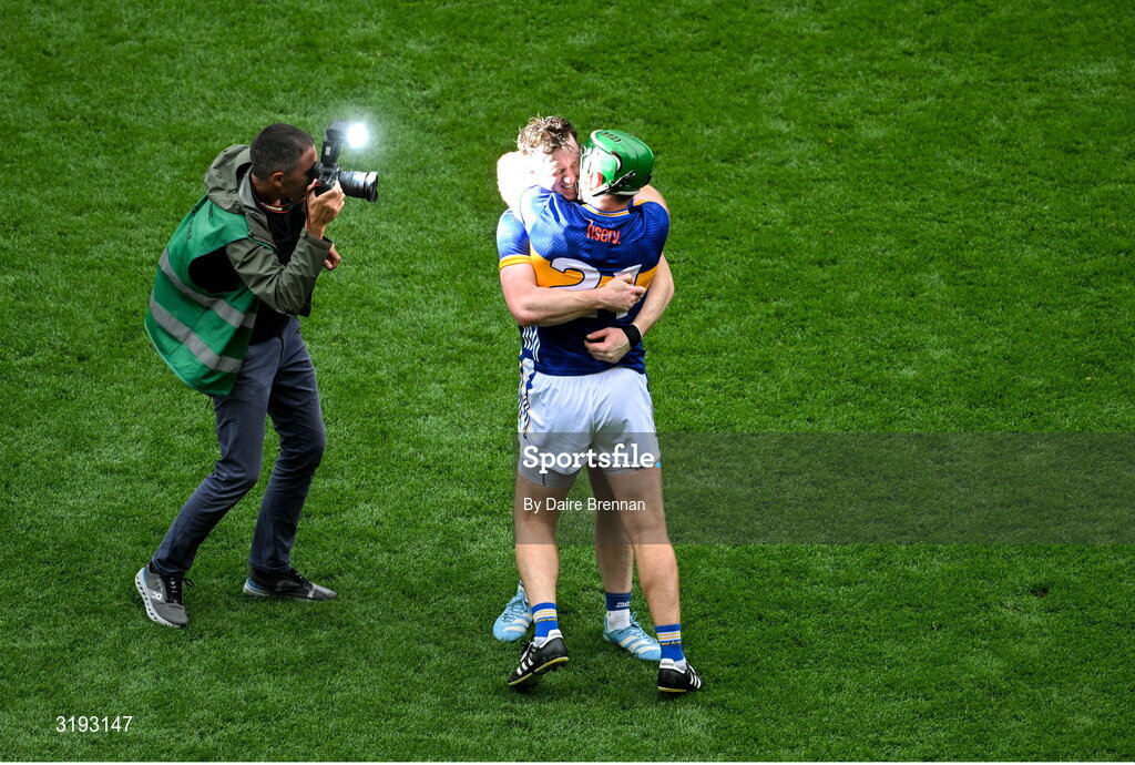 20 July 2025; Jake Morris, left, and Noel McGrath of Tipperary celebrate after the GAA Hurling All-Ireland Senior Championship final match between Cork and Tipperary at Croke Park in Dublin. Photo by Daire Brennan/Sportsfile