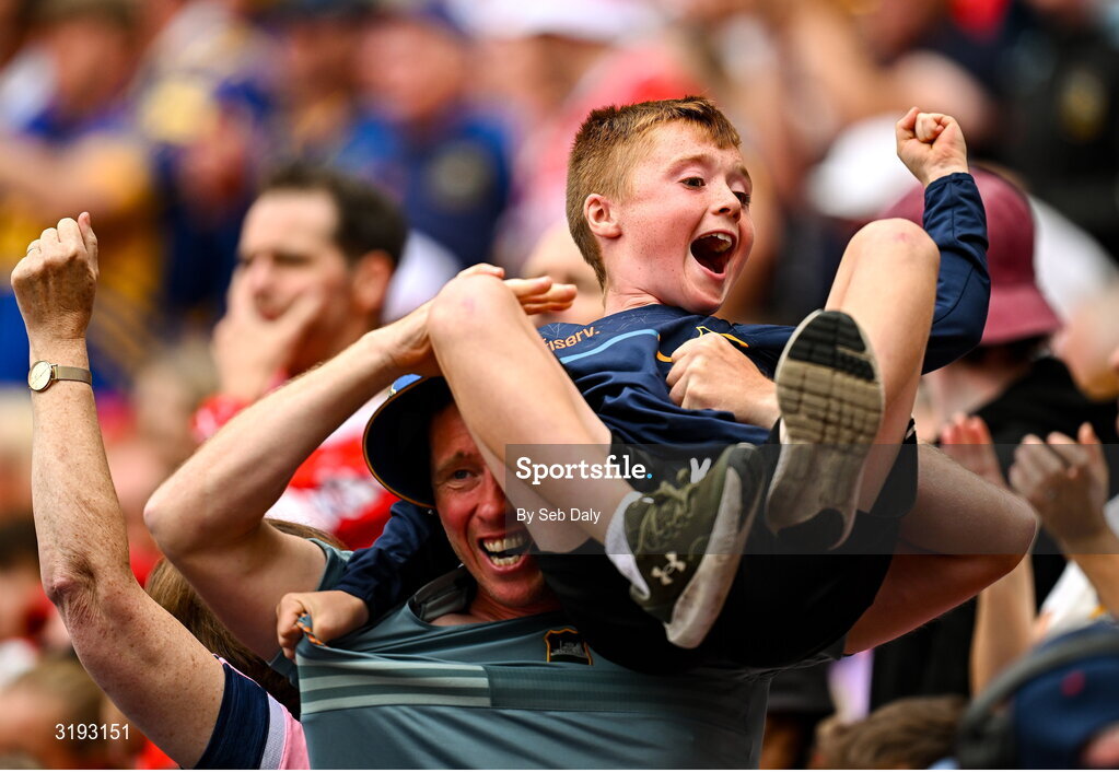 20 July 2025; Tipperary supporters celebrate their side's third goal during the GAA Hurling All-Ireland Senior Championship final match between Cork and Tipperary at Croke Park in Dublin. Photo by Seb Daly/Sportsfile