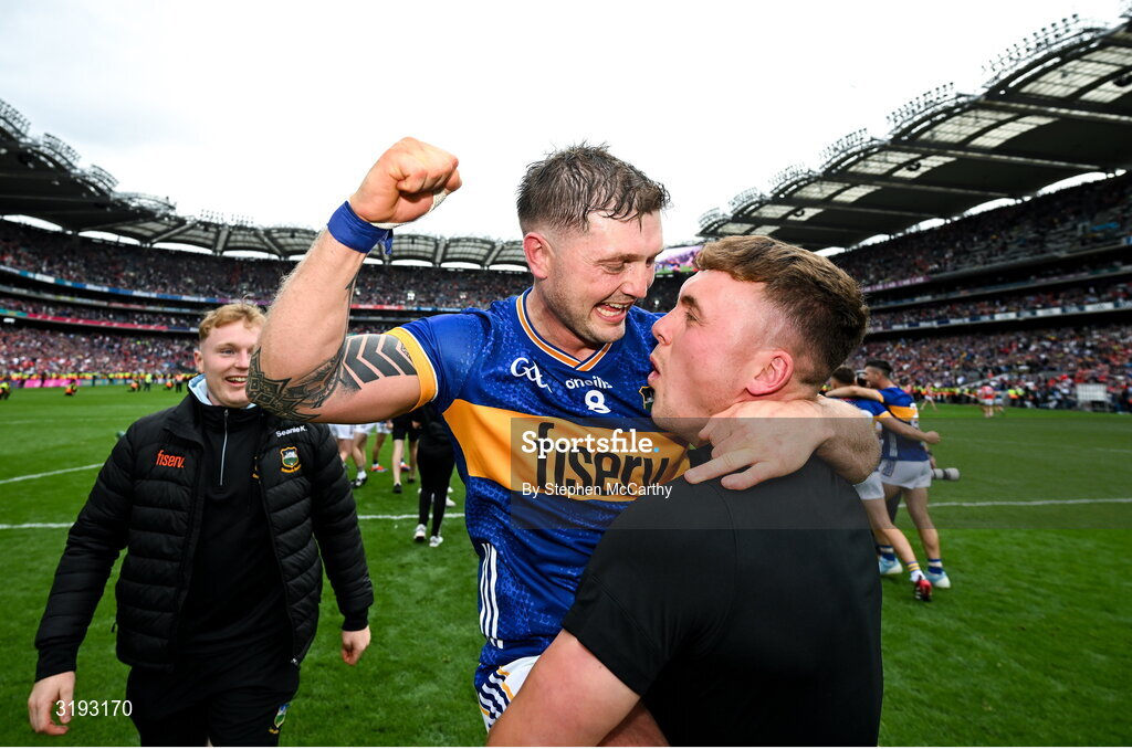20 July 2025; Willie Connors of Tipperary celebrates with Kieran Cummins after the GAA Hurling All-Ireland Senior Championship final match between Cork and Tipperary at Croke Park in Dublin. Photo by Stephen McCarthy/Sportsfile