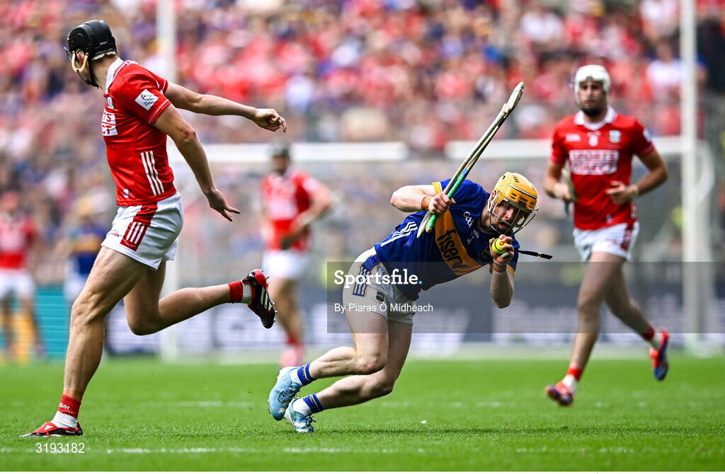 20 July 2025; Andrew Ormond of Tipperary gets tangled up with the hurl of Robert Downey of Cork during the GAA Hurling All-Ireland Senior Championship final match between Cork and Tipperary at Croke Park in Dublin. Photo by Piaras Ó Mídheach/Sportsfile
