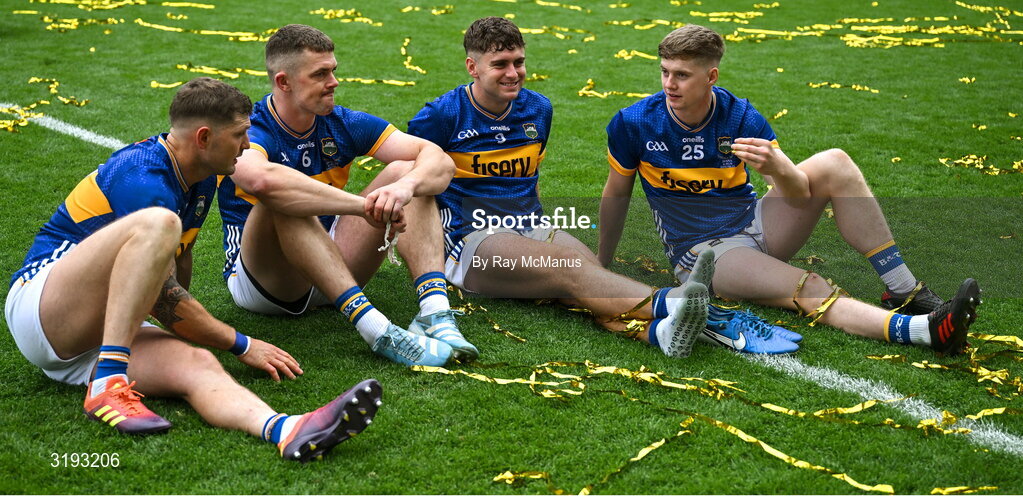 20 July 2025; Tipperary players, from left, Willie Connors, Ronan Maher Conor Stakelum and Darragh Stakelum relax on the pitch after the GAA Hurling All-Ireland Senior Championship final match between Cork and Tipperary at Croke Park in Dublin. Photo by Ray McManus/Sportsfile
