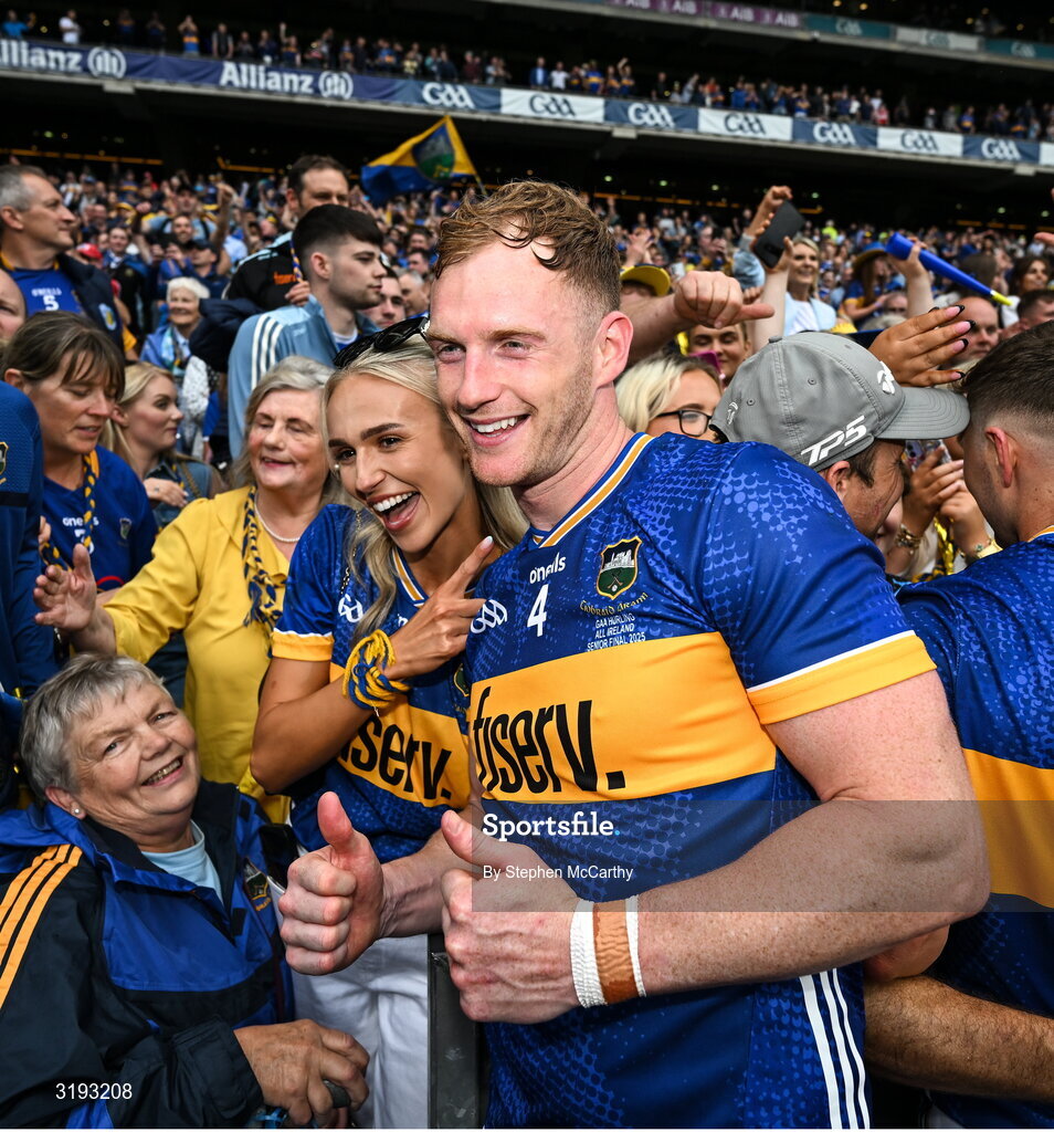 20 July 2025; Michael Breen of Tipperary celebrates with his girlfriend Irish Olympian Sharlene Mawdsley after the GAA Hurling All-Ireland Senior Championship final match between Cork and Tipperary at Croke Park in Dublin. Photo by Stephen McCarthy/Sportsfile