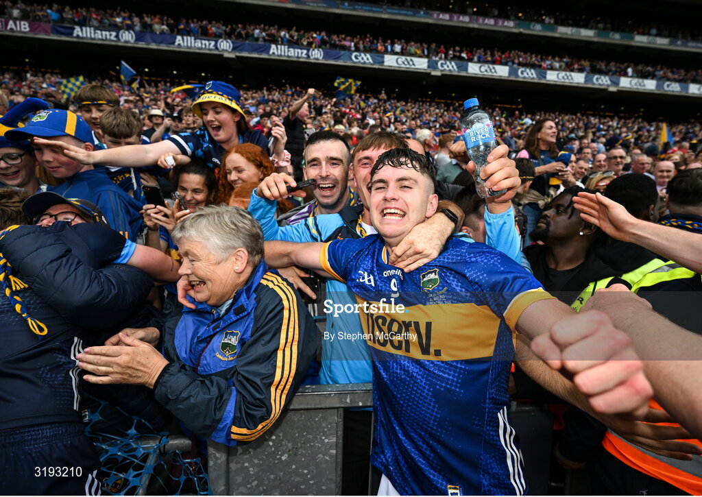 20 July 2025; Conor Stakelum of Tipperary celebrates with supporters after the GAA Hurling All-Ireland Senior Championship final match between Cork and Tipperary at Croke Park in Dublin. Photo by Stephen McCarthy/Sportsfile