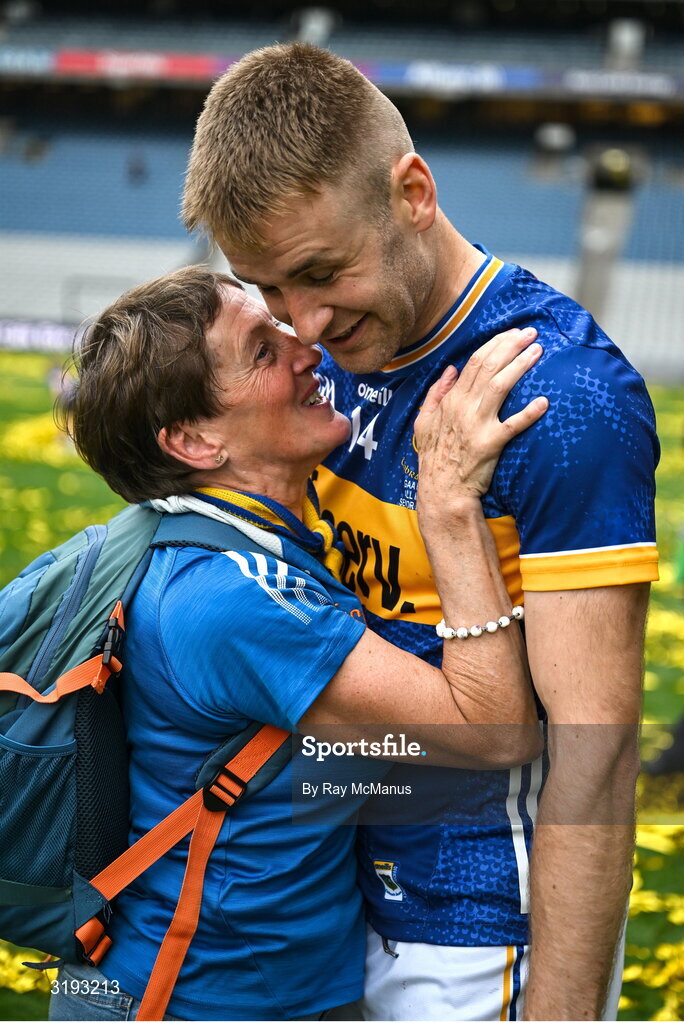 20 July 2025; John McGrath of Tipperary and his aunt Teresa O'Connell after the GAA Hurling All-Ireland Senior Championship final match between Cork and Tipperary at Croke Park in Dublin. Photo by Ray McManus/Sportsfile