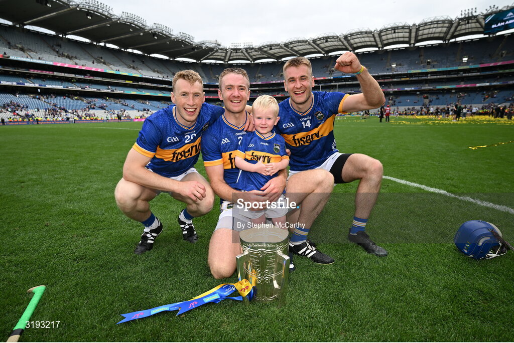 20 July 2025; Tipperary brothers, from left, Brian McGrath, Noel McGrath, and his son Sam, and John McGrath celebrate with the Liam MacCarthy cup after their side's victory in the GAA Hurling All-Ireland Senior Championship final match between Cork and Tipperary at Croke Park in Dublin. Photo by Stephen McCarthy/Sportsfile