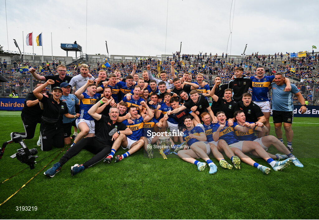 20 July 2025; Tipperary players and staff celebrate with the Liam MacCarthy cup after their side's victory in the GAA Hurling All-Ireland Senior Championship final match between Cork and Tipperary at Croke Park in Dublin. Photo by Stephen McCarthy/Sportsfile