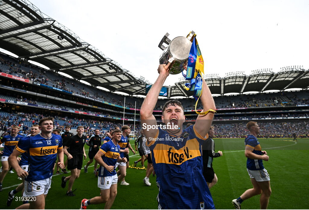 20 July 2025; Conor Stakelum of Tipperary celebrates with the Liam MacCarthy cup after their side's victory in the GAA Hurling All-Ireland Senior Championship final match between Cork and Tipperary at Croke Park in Dublin. Photo by Stephen McCarthy/Sportsfile