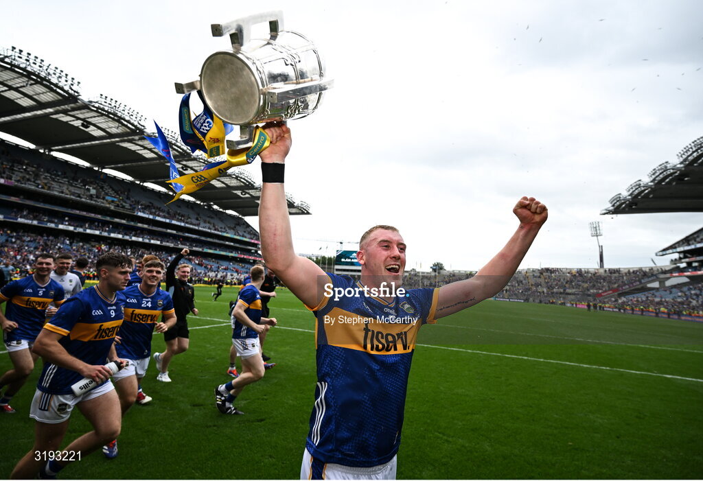 20 July 2025; Eoghan Connolly of Tipperary celebrates with the Liam MacCarthy cup after their side's victory in the GAA Hurling All-Ireland Senior Championship final match between Cork and Tipperary at Croke Park in Dublin. Photo by Stephen McCarthy/Sportsfile