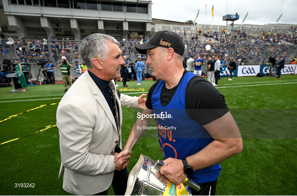 20 July 2025; Tipperary manager Liam Cahill is congratulated by former Tipperary manager Liam Sheedy after the GAA Hurling All-Ireland Senior Championship final match between Cork and Tipperary at Croke Park in Dublin. Photo by Stephen McCarthy/Sportsfile