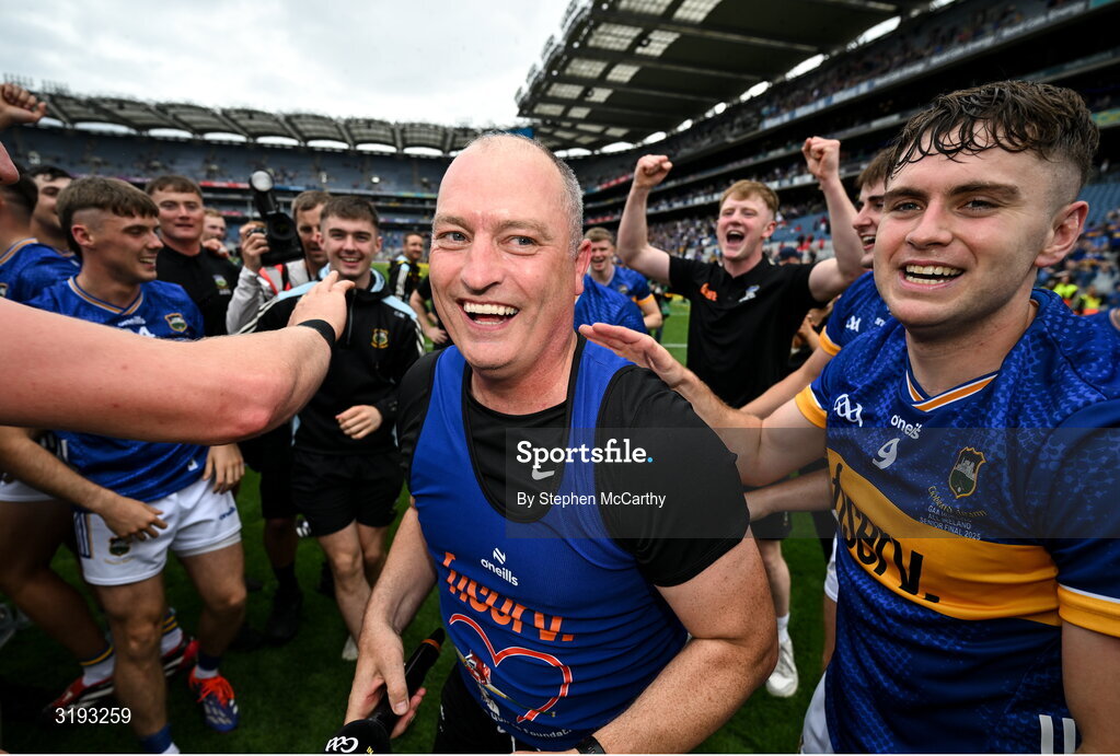 20 July 2025; Tipperary manager Liam Cahill celebrates with the Liam MacCarthy cup after their side's victory in the GAA Hurling All-Ireland Senior Championship final match between Cork and Tipperary at Croke Park in Dublin. Photo by Stephen McCarthy/Sportsfile