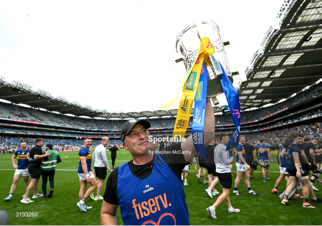 20 July 2025; Tipperary manager Liam Cahill celebrates with the Liam MacCarthy cup after their side's victory in the GAA Hurling All-Ireland Senior Championship final match between Cork and Tipperary at Croke Park in Dublin. Photo by Stephen McCarthy/Sportsfile