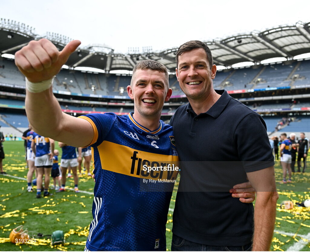 20 July 2025; The 2019 Tipperary winning captain Séamus Callanan celebrates with the current captain Ronan Maher after the GAA Hurling All-Ireland Senior Championship final match between Cork and Tipperary at Croke Park in Dublin. Photo by Ray McManus/Sportsfile