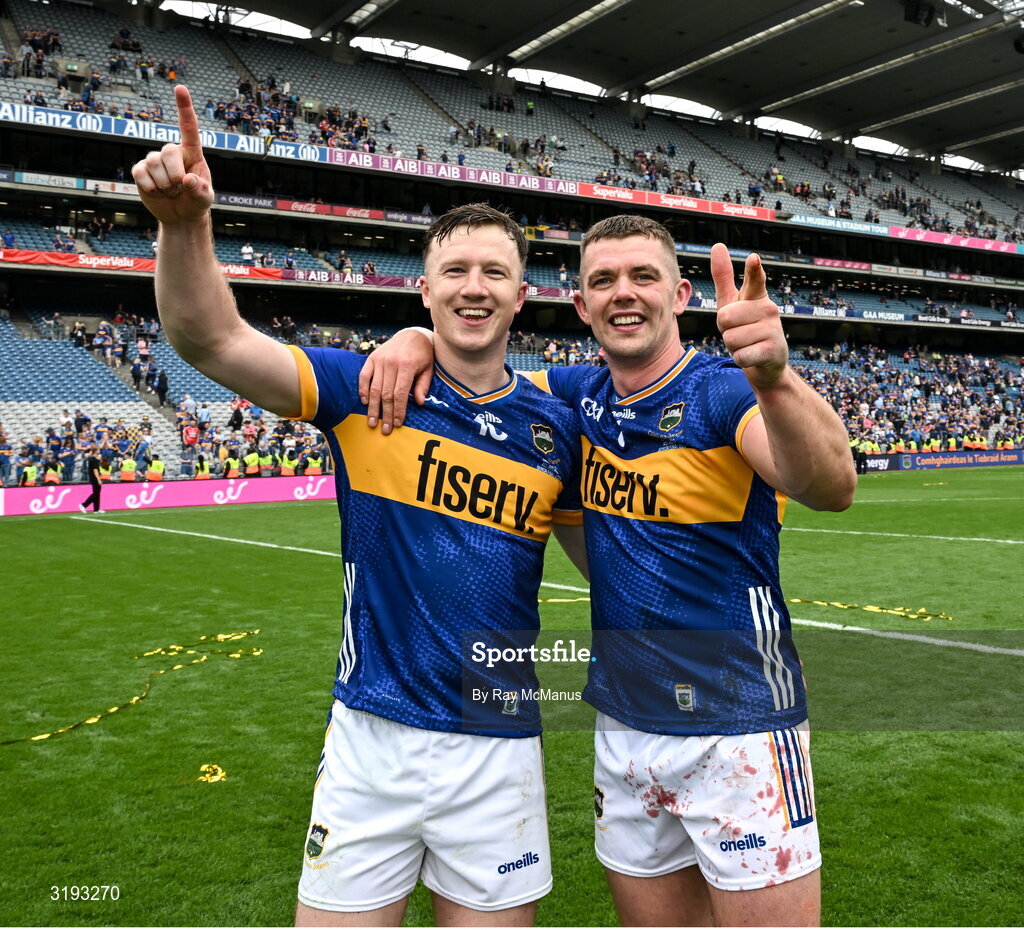 20 July 2025; Jake Morris, left and Tipperary captain Ronan Maher celebrate after the GAA Hurling All-Ireland Senior Championship final match between Cork and Tipperary at Croke Park in Dublin. Photo by Ray McManus/Sportsfile