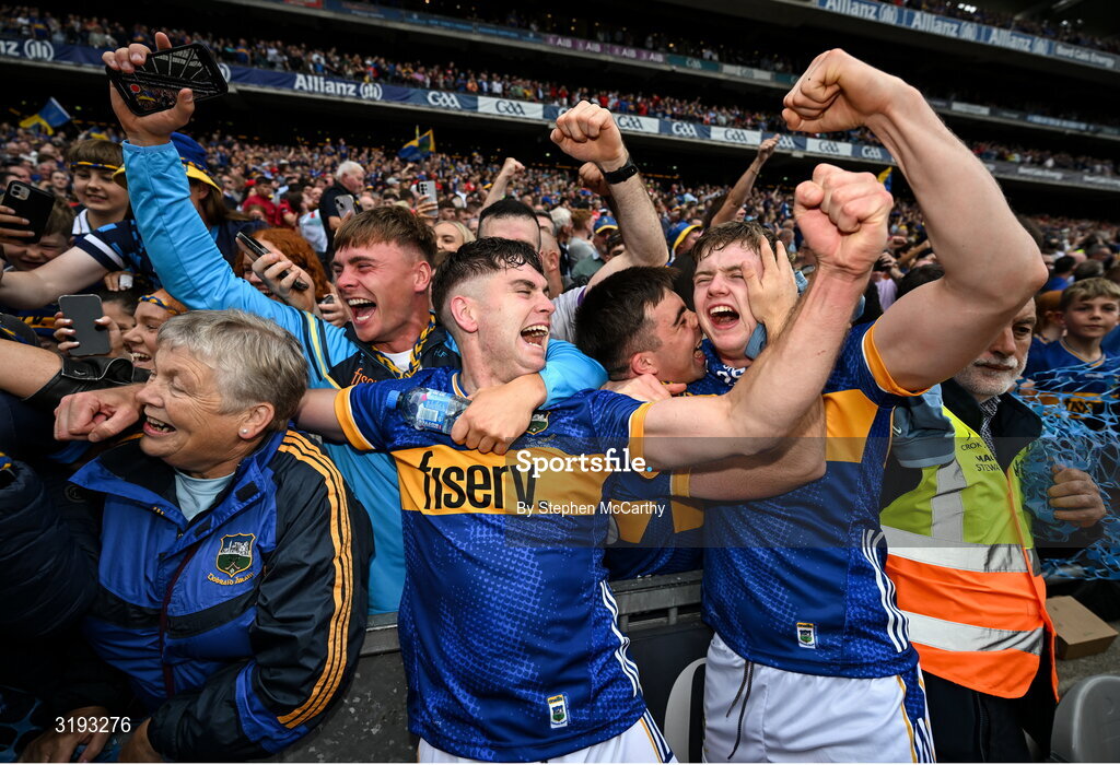 20 July 2025; Conor Stakelum and Darragh Stakelum, right, of Tipperary celebrates with supporters after the GAA Hurling All-Ireland Senior Championship final match between Cork and Tipperary at Croke Park in Dublin. Photo by Stephen McCarthy/Sportsfile