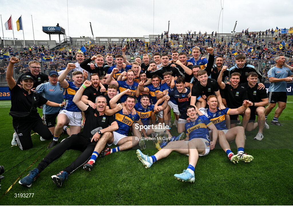 20 July 2025; Tipperary players and staff celebrate with the Liam MacCarthy cup after their side's victory in the GAA Hurling All-Ireland Senior Championship final match between Cork and Tipperary at Croke Park in Dublin. Photo by Stephen McCarthy/Sportsfile