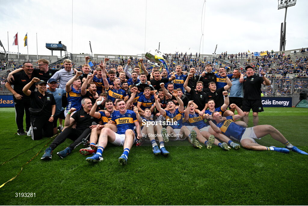 20 July 2025; Tipperary players and staff celebrate with the Liam MacCarthy cup after their side's victory in the GAA Hurling All-Ireland Senior Championship final match between Cork and Tipperary at Croke Park in Dublin. Photo by Stephen McCarthy/Sportsfile