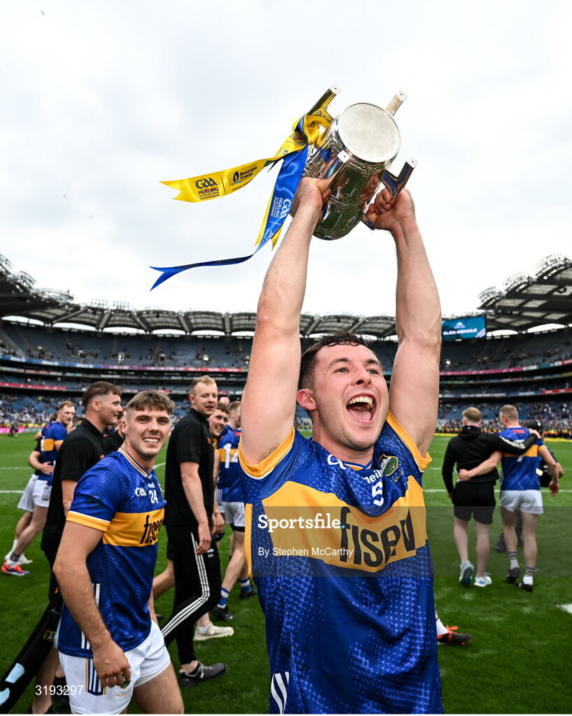 20 July 2025; Craig Morgan of Tipperary celebrates with the Liam MacCarthy cup after their side's victory in after the GAA Hurling All-Ireland Senior Championship final match between Cork and Tipperary at Croke Park in Dublin. Photo by Stephen McCarthy/Sportsfile