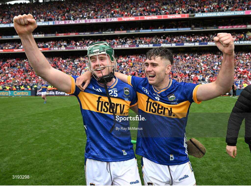 20 July 2025; Brothers Darragh and Conor Stakelum of Tipperary celebrate after the GAA Hurling All-Ireland Senior Championship final match between Cork and Tipperary at Croke Park in Dublin. Photo by Ray McManus/Sportsfile