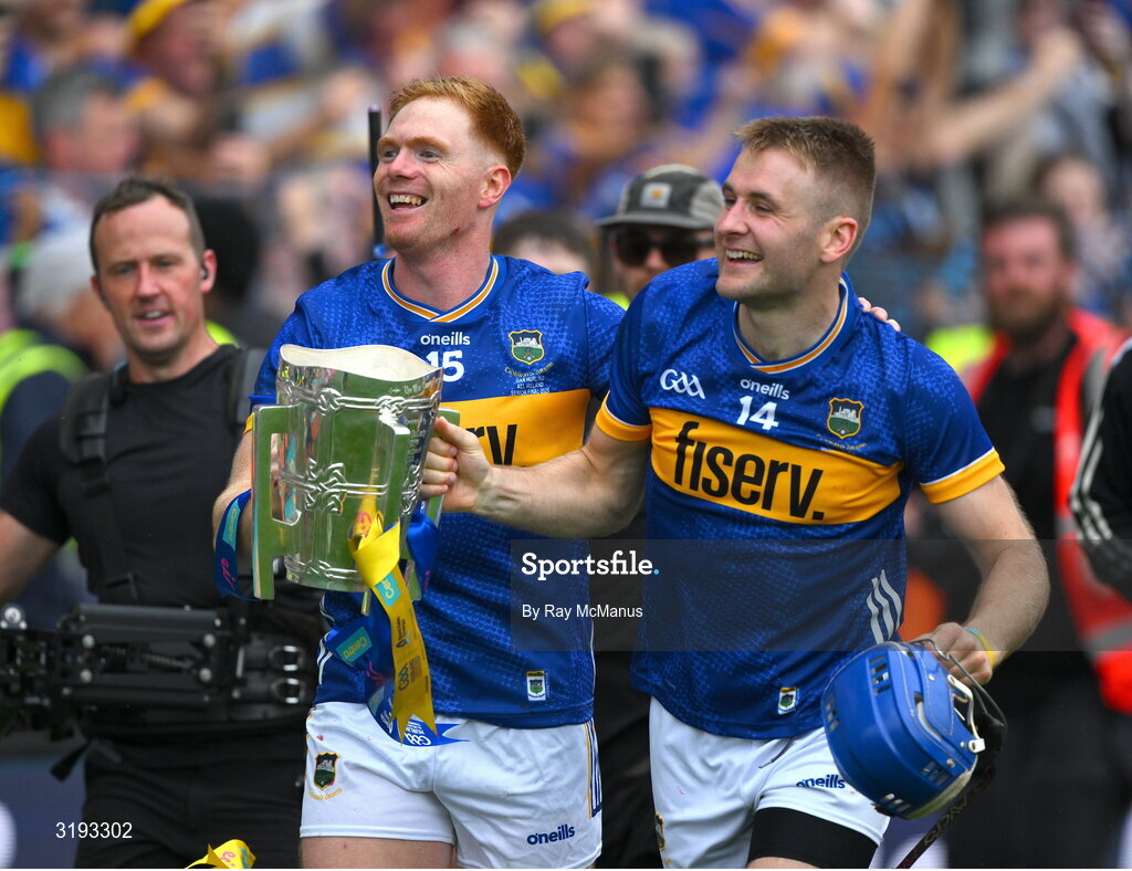 20 July 2025; Jason Forde, left, and John McGrath of Tipperary celebrate with the Liam MacCarthy Cup after the GAA Hurling All-Ireland Senior Championship final match between Cork and Tipperary at Croke Park in Dublin. Photo by Ray McManus/Sportsfile