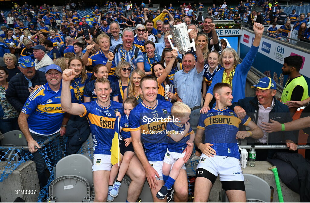 20 July 2025; Tipperary brothers, from left, Brian McGrath, Noel McGrath and John McGrath celebrate with the Liam MacCarthy cup and family after their side's victory in the GAA Hurling All-Ireland Senior Championship final match between Cork and Tipperary at Croke Park in Dublin. Photo by Stephen McCarthy/Sportsfile