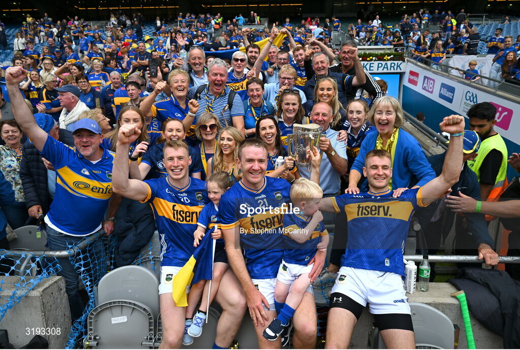 20 July 2025; Tipperary brothers, from left, Brian McGrath, Noel McGrath and John McGrath celebrate with the Liam MacCarthy cup and family after their side's victory in the GAA Hurling All-Ireland Senior Championship final match between Cork and Tipperary at Croke Park in Dublin. Photo by Stephen McCarthy/Sportsfile