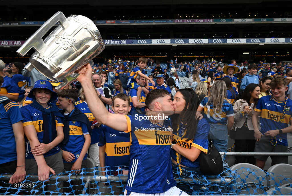 20 July 2025; Conor Stakelum of Tipperary celebrates with his partner Lauren McCormack and the Liam MacCarthy cup after the GAA Hurling All-Ireland Senior Championship final match between Cork and Tipperary at Croke Park in Dublin. Photo by Stephen McCarthy/Sportsfile