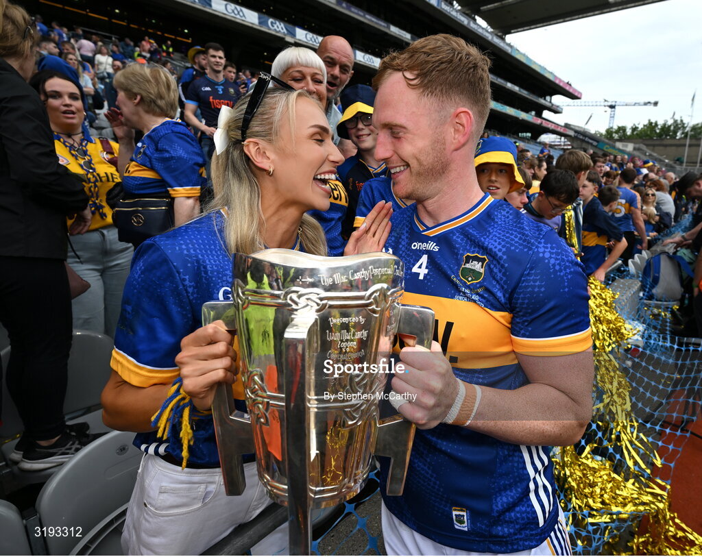 20 July 2025; Michael Breen of Tipperary and his partner Irish Olympian Sharlene Mawdsley celebrate with the Liam MacCarthy cup after their side's victory in the GAA Hurling All-Ireland Senior Championship final match between Cork and Tipperary at Croke Park in Dublin. Photo by Stephen McCarthy/Sportsfile