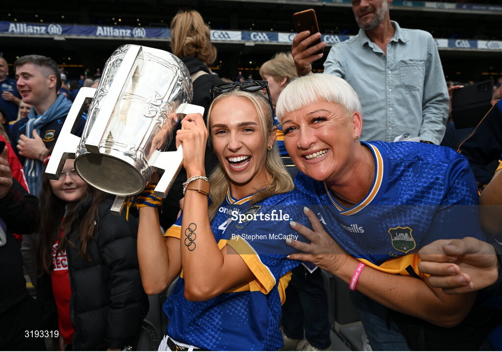 20 July 2025; Irish Olympian, Sharlene Mawdsley, partner of Tipperary's Michael Breen, and Ali Smith, right, celebrate with the Liam MacCarthy cup after the GAA Hurling All-Ireland Senior Championship final match between Cork and Tipperary at Croke Park in Dublin. Photo by Stephen McCarthy/Sportsfile
