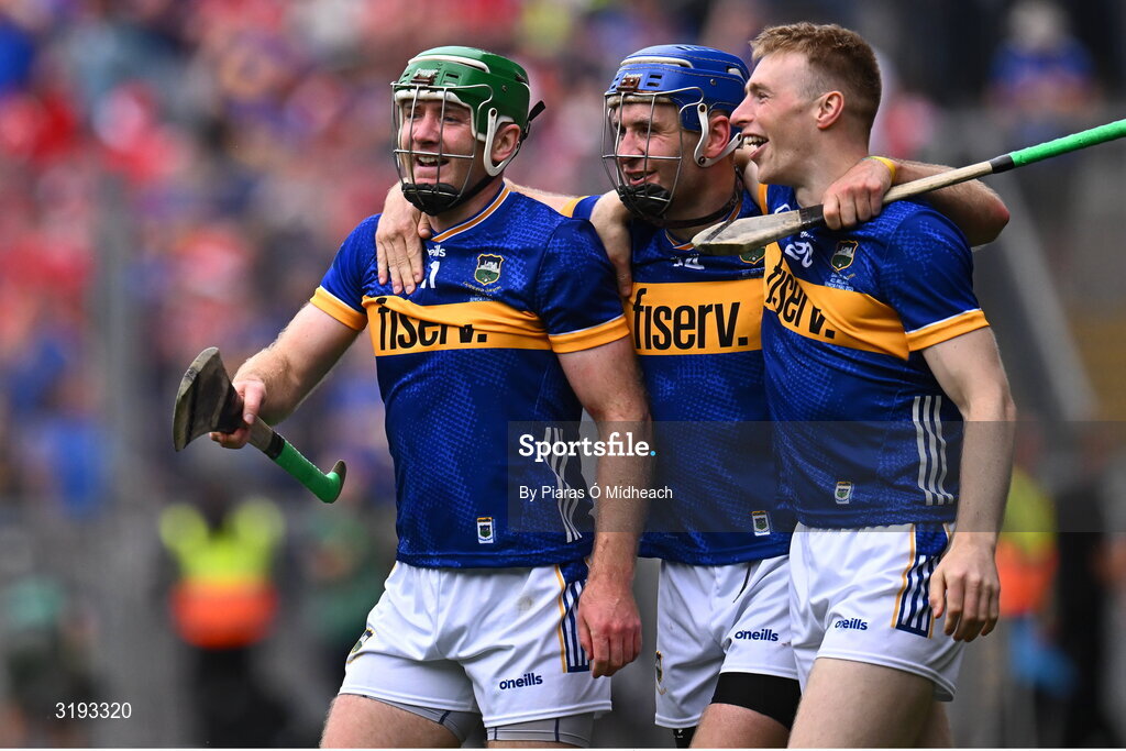 20 July 2025; Tipperary hurlers the McGrath brothers, from left, Noel, John and Brian after their side's victory the GAA Hurling All-Ireland Senior Championship final match between Cork and Tipperary at Croke Park in Dublin. Photo by Piaras Ó Mídheach/Sportsfile
