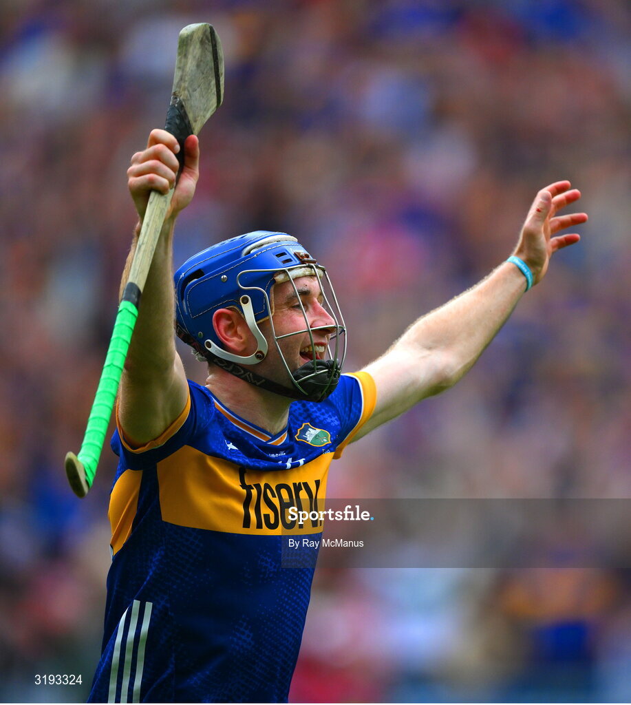 20 July 2025; John McGrath of Tipperary celebrates as the final whistle is blown the GAA Hurling All-Ireland Senior Championship final match between Cork and Tipperary at Croke Park in Dublin. Photo by Ray McManus/Sportsfile
