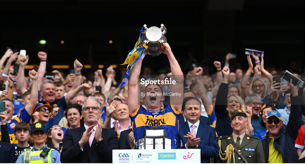 20 July 2025; Tipperary captain Ronan Maher lifts the Liam MacCarthy cup after victory in the GAA Hurling All-Ireland Senior Championship final match between Cork and Tipperary at Croke Park in Dublin. Photo by Stephen McCarthy/Sportsfile