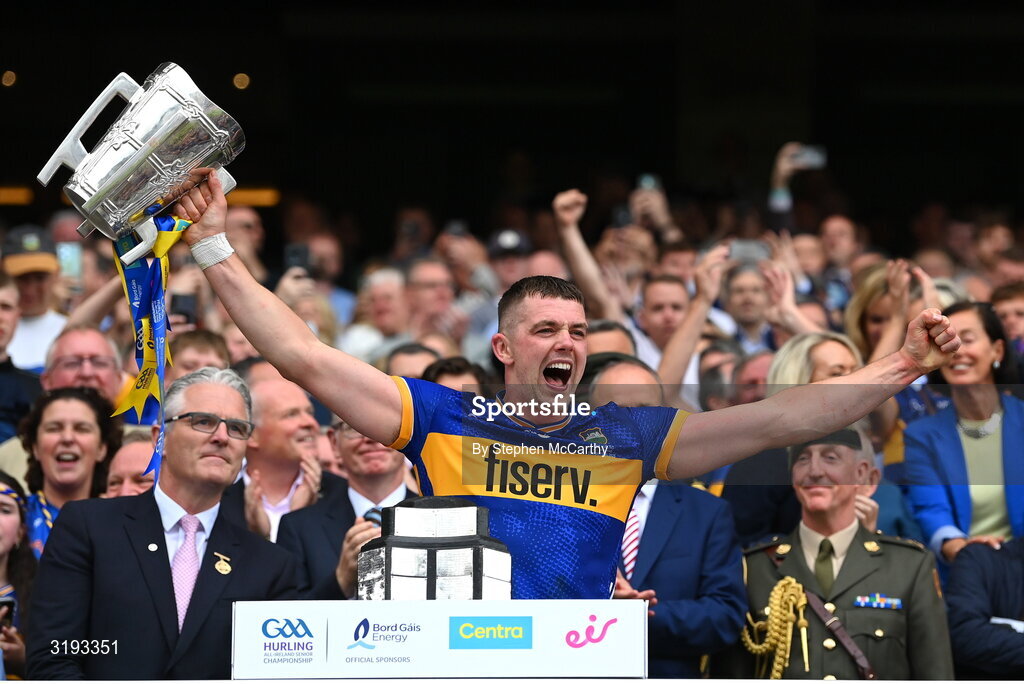 20 July 2025; Tipperary captain Ronan Maher lifts the Liam MacCarthy cup after victory in the GAA Hurling All-Ireland Senior Championship final match between Cork and Tipperary at Croke Park in Dublin. Photo by Stephen McCarthy/Sportsfile