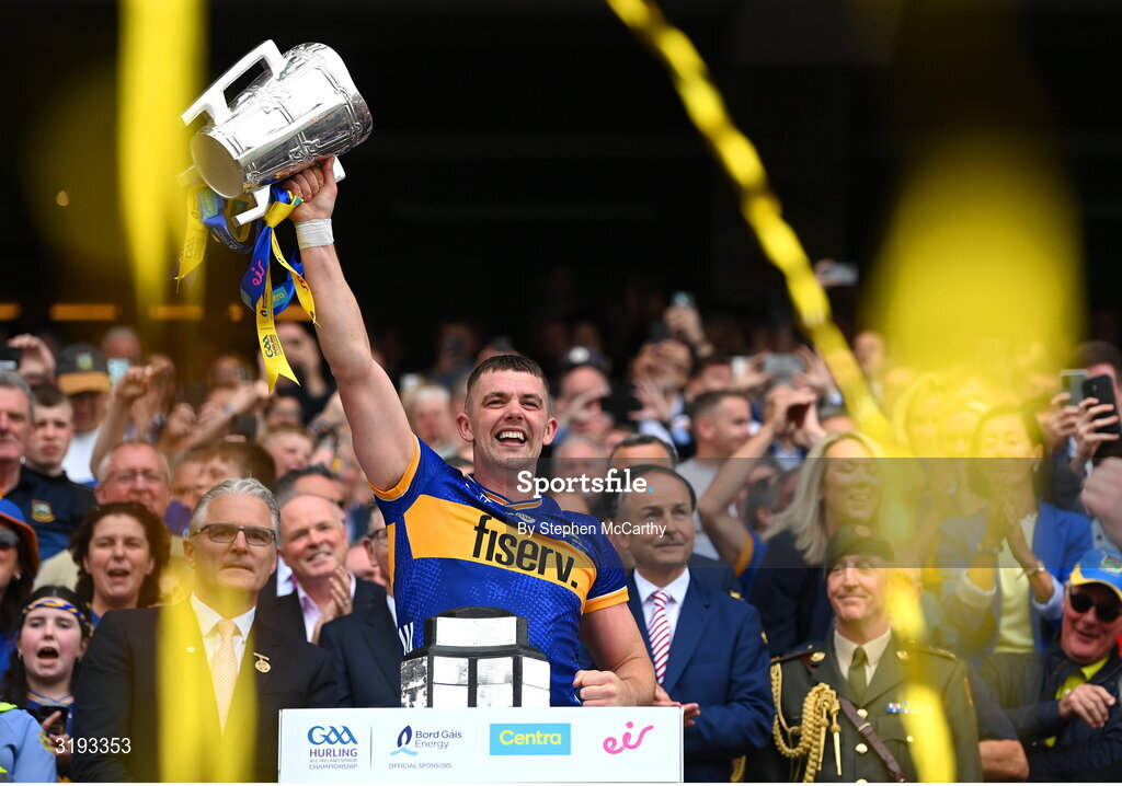 20 July 2025; Tipperary captain Ronan Maher lifts the Liam MacCarthy cup after victory in the GAA Hurling All-Ireland Senior Championship final match between Cork and Tipperary at Croke Park in Dublin. Photo by Stephen McCarthy/Sportsfile