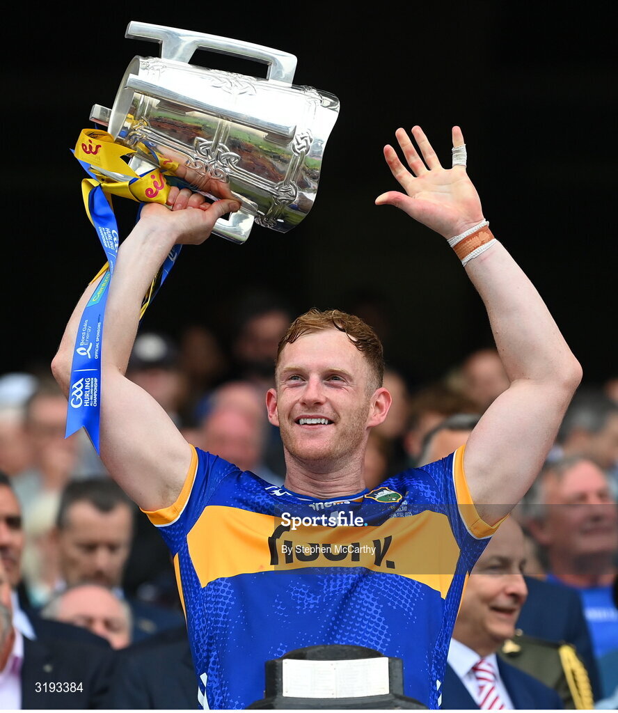 20 July 2025; Michael Breen of Tipperary lifts the Liam MacCarthy cup after the GAA Hurling All-Ireland Senior Championship final match between Cork and Tipperary at Croke Park in Dublin. Photo by Stephen McCarthy/Sportsfile