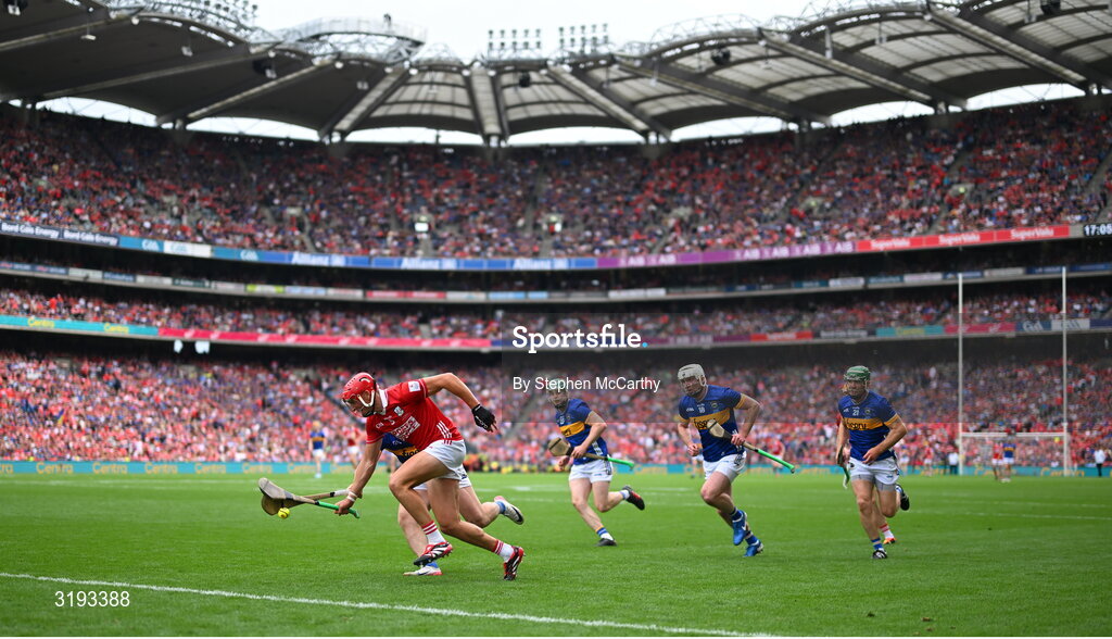 20 July 2025; Ciarán Joyce of Cork in action against Darragh McCarthy of Tipperary during the GAA Hurling All-Ireland Senior Championship final match between Cork and Tipperary at Croke Park in Dublin. Photo by Stephen McCarthy/Sportsfile