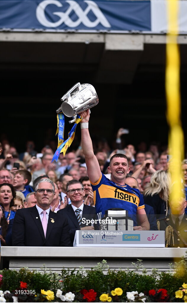 20 July 2025; Tipperary captain Ronan Maher lifts the Liam MacCarthy Cup after his side's victory in the GAA Hurling All-Ireland Senior Championship final match between Cork and Tipperary at Croke Park in Dublin. Photo by Piaras Ó Mídheach/Sportsfile