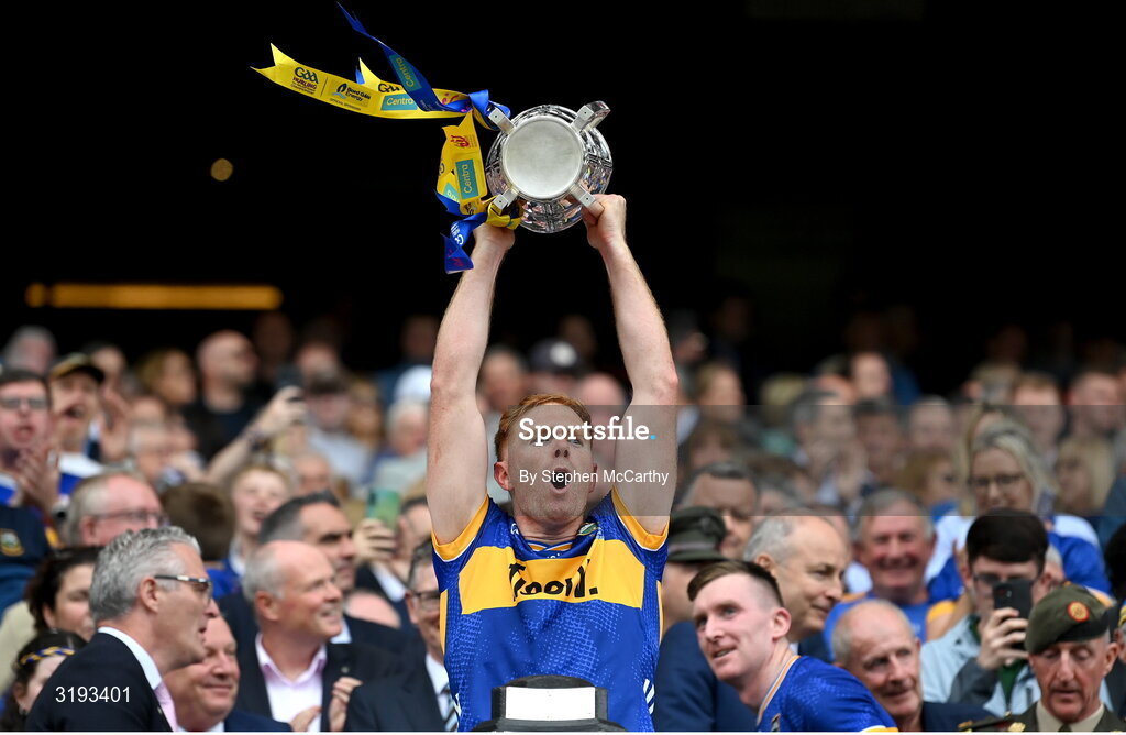 20 July 2025; Jason Forde of Tipperary lifts the Liam MacCarthy cup after the GAA Hurling All-Ireland Senior Championship final match between Cork and Tipperary at Croke Park in Dublin. Photo by Stephen McCarthy/Sportsfile