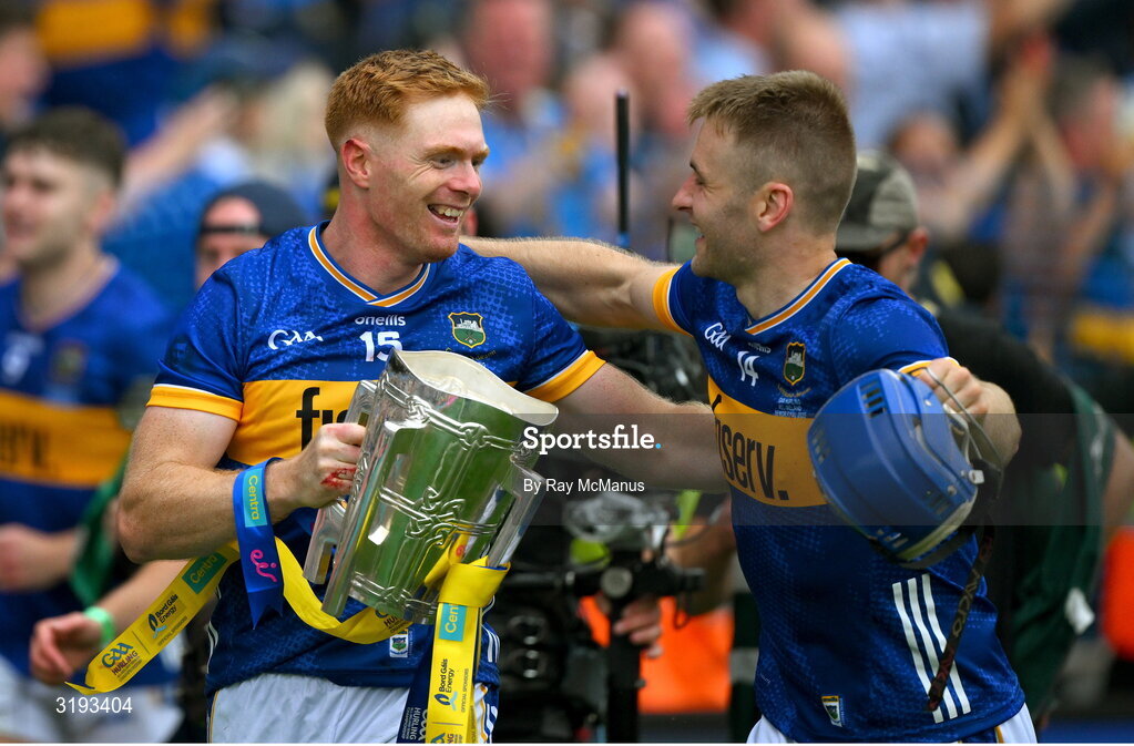 20 July 2025; Jason Forde, left, and John McGrath of Tipperary celebrate with the Liam MacCarthy Cup after the GAA Hurling All-Ireland Senior Championship final match between Cork and Tipperary at Croke Park in Dublin. Photo by Ray McManus/Sportsfile