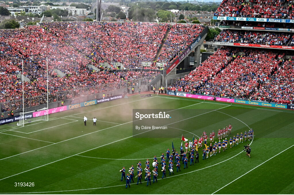 20 July 2025; The Tipperary and Cork teams parade behind the Artane School of Music Band ahead of the GAA Hurling All-Ireland Senior Championship final match between Cork and Tipperary at Croke Park in Dublin. Photo by Daire Brennan/Sportsfile