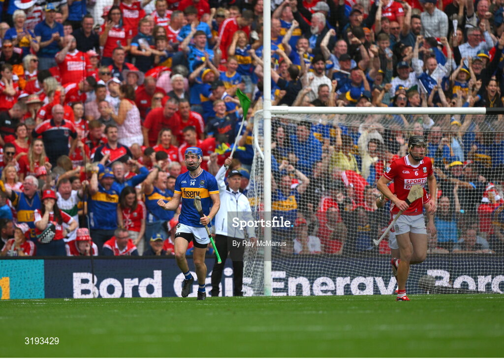 20 July 2025; John McGrath of Tipperary cebrates scoring his side's first goal during the GAA Hurling All-Ireland Senior Championship final match between Cork and Tipperary at Croke Park in Dublin. Photo by Ray McManus/Sportsfile