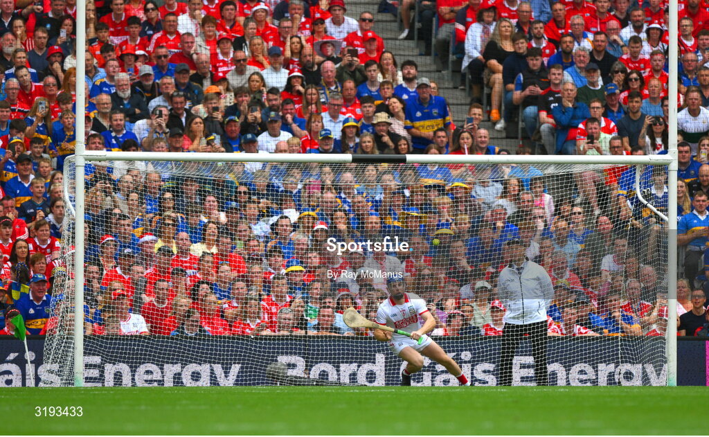 20 July 2025; Cork goalkeeper Patrick Collins is beaten for a Tipperary goal, a penalty in the 55th minute, during the GAA Hurling All-Ireland Senior Championship final match between Cork and Tipperary at Croke Park in Dublin. Photo by Ray McManus/Sportsfile