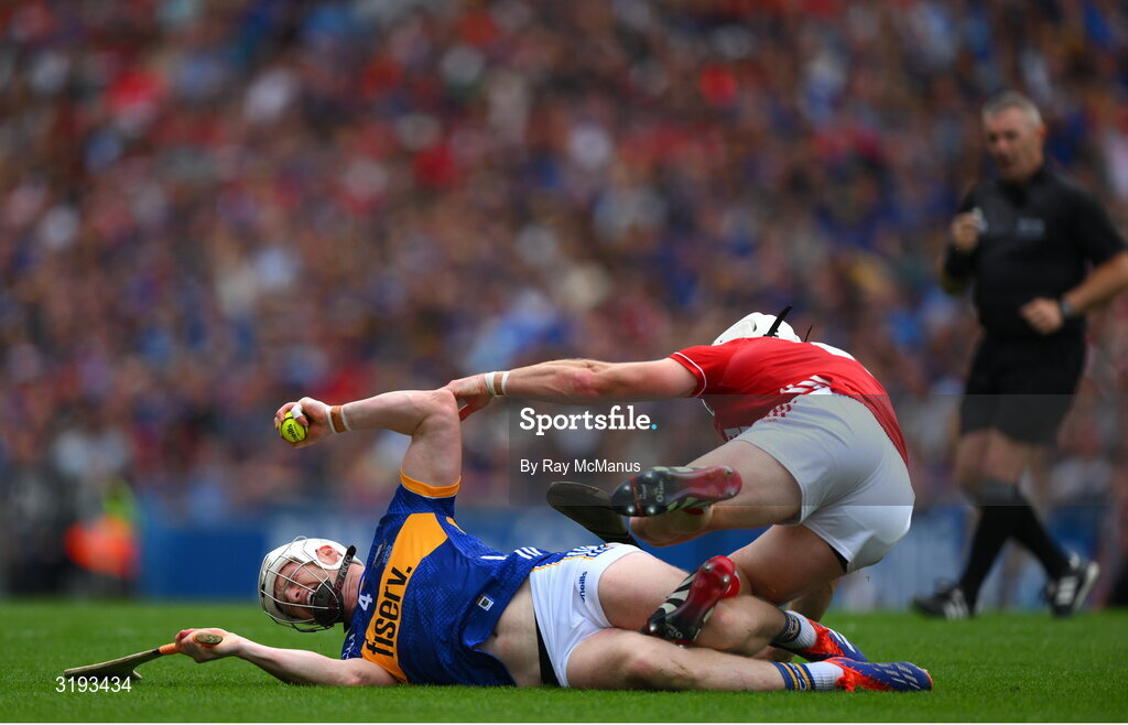 20 July 2025; Michael Breen of Tipperary is tackled by Patrick Horgan of Cork during the GAA Hurling All-Ireland Senior Championship final match between Cork and Tipperary at Croke Park in Dublin. Photo by Ray McManus/Sportsfile
