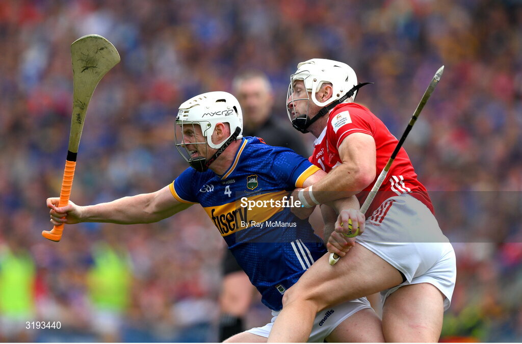 20 July 2025; Michael Breen of Tipperary is tackled by Patrick Horgan of Cork during the GAA Hurling All-Ireland Senior Championship final match between Cork and Tipperary at Croke Park in Dublin. Photo by Ray McManus/Sportsfile
