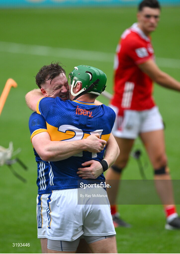 20 July 2025; Noel McGrath and Jake Morris of Tipperary celebrate after the GAA Hurling All-Ireland Senior Championship final match between Cork and Tipperary at Croke Park in Dublin. Photo by Ray McManus/Sportsfile
