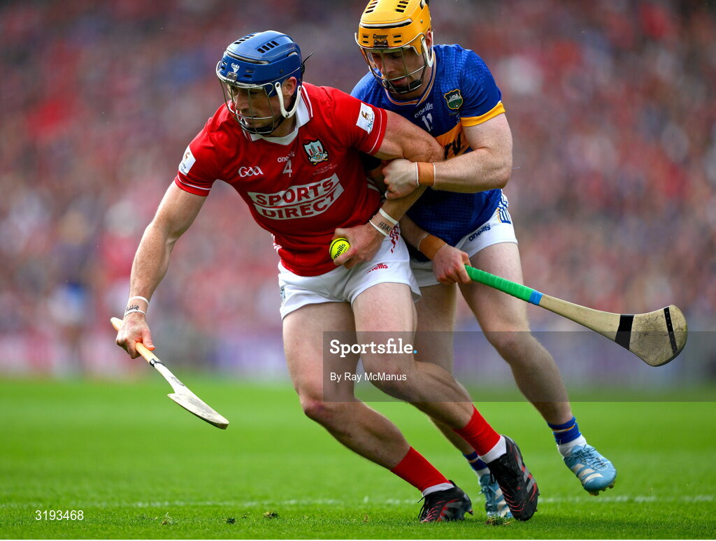 20 July 2025; Seán O'Donoghue of Cork is tackled by Jason Forde of Tipperary during the GAA Hurling All-Ireland Senior Championship final match between Cork and Tipperary at Croke Park in Dublin. Photo by Ray McManus/Sportsfile